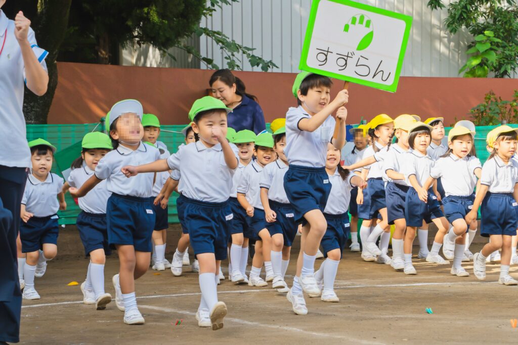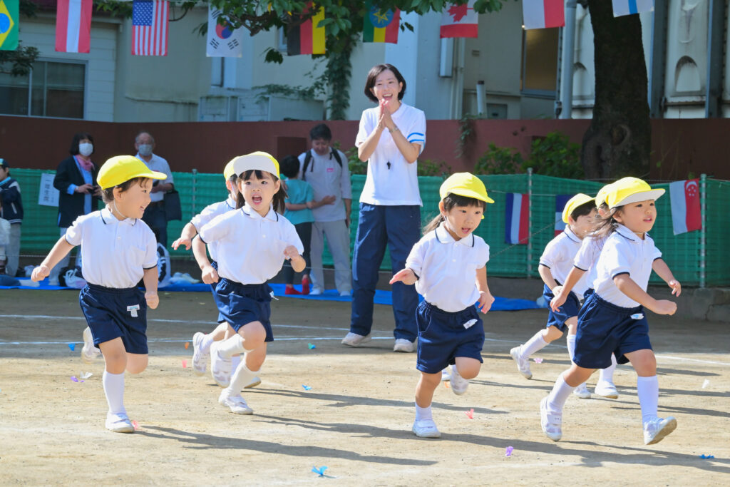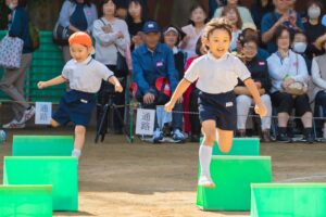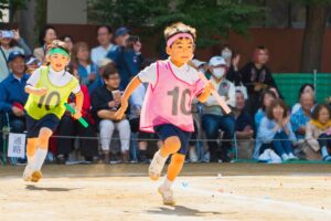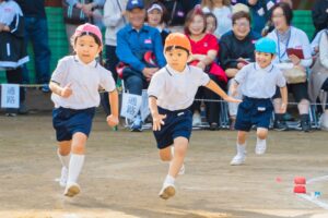 年長児は幼稚園最後の運動会。力いっぱい走ります。