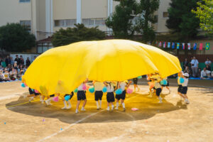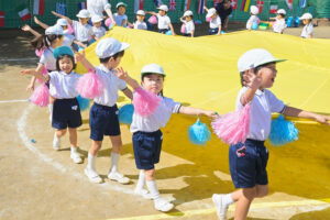 パラバルーンを使ったおゆうぎでは、元気なかけ声で思い切り体を動かします。