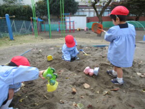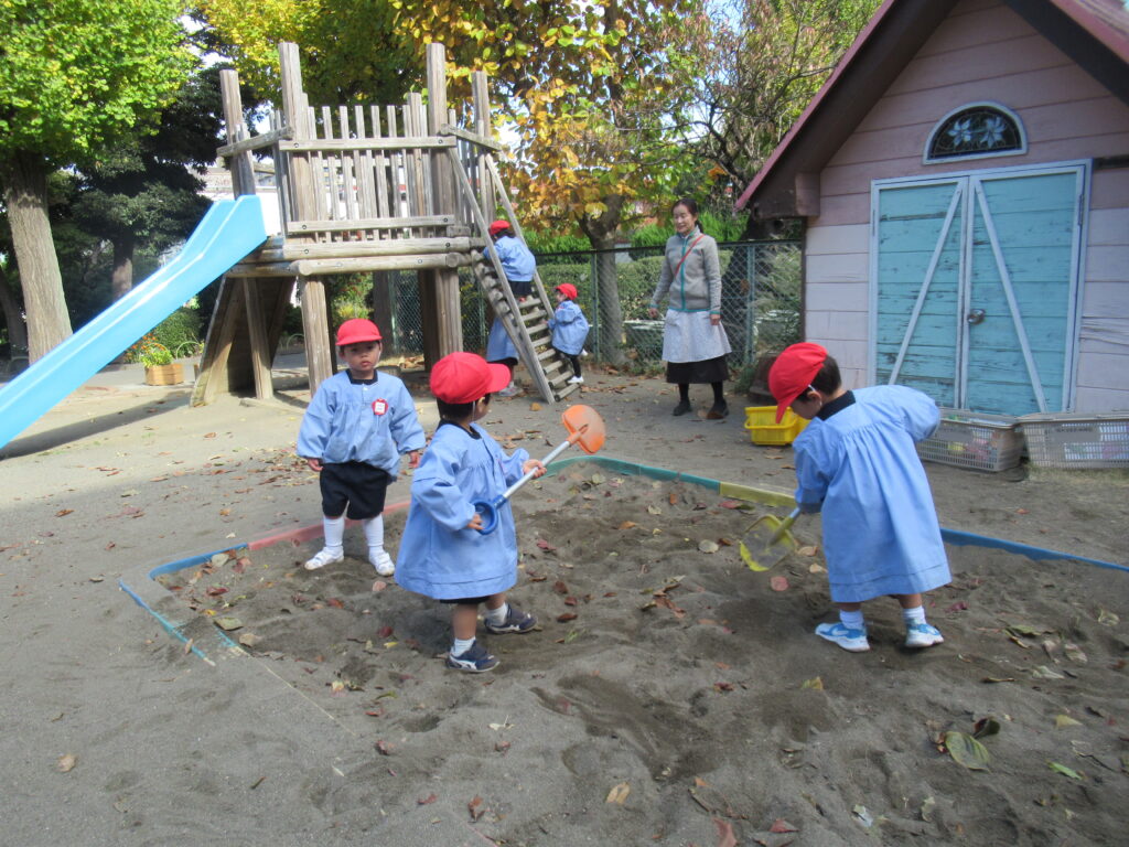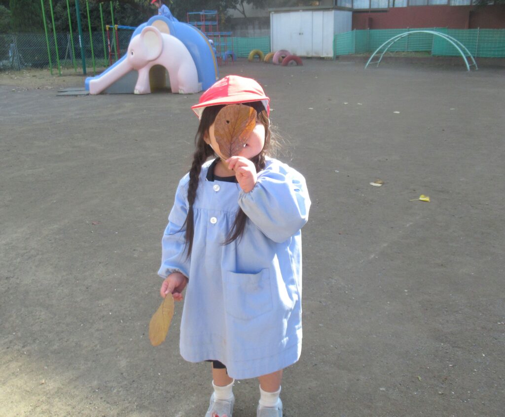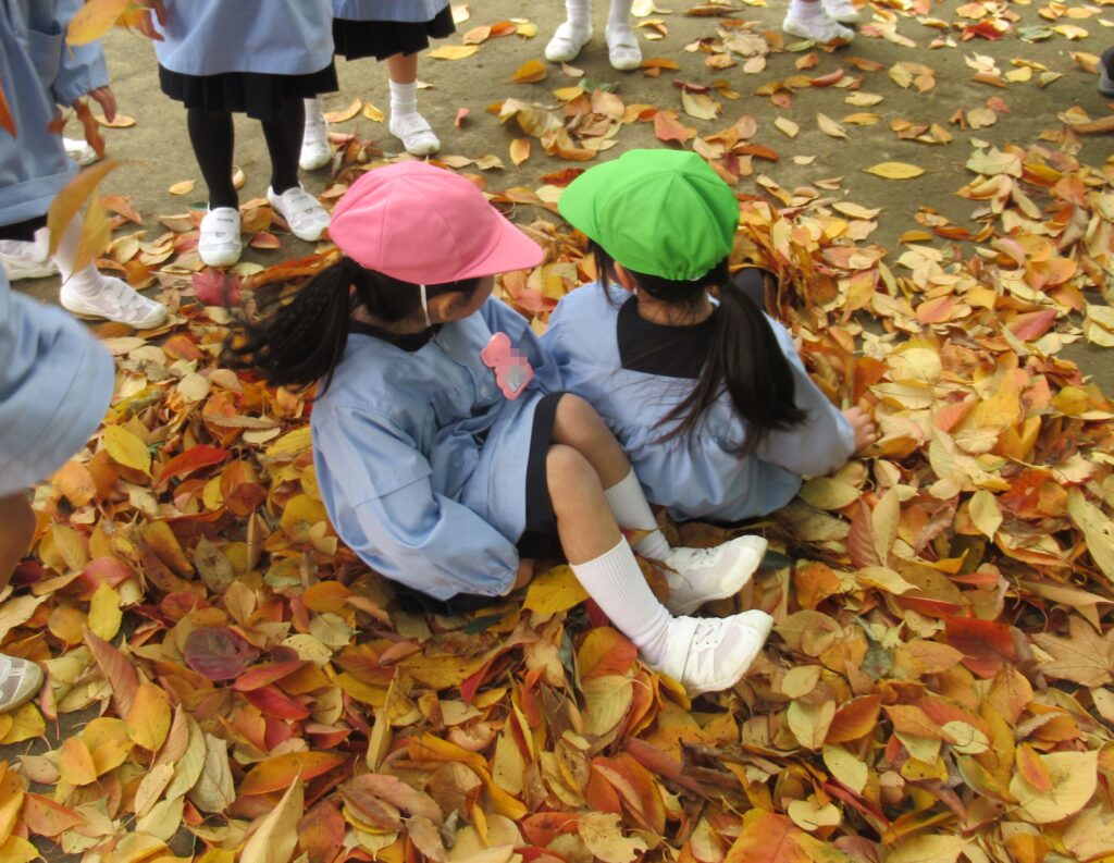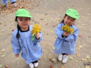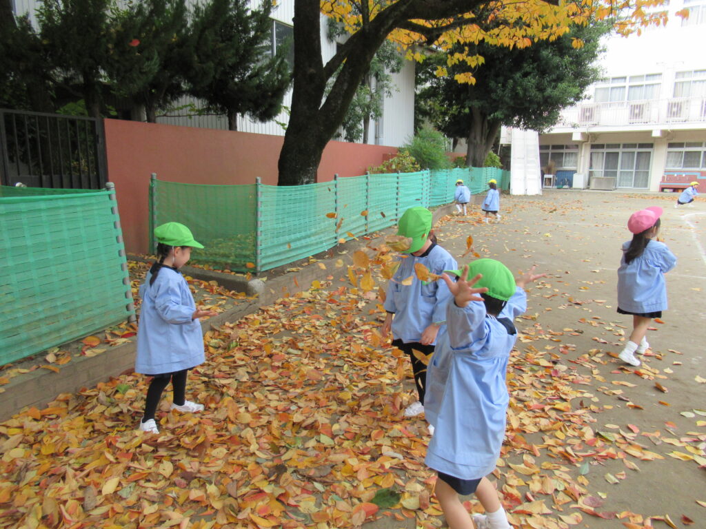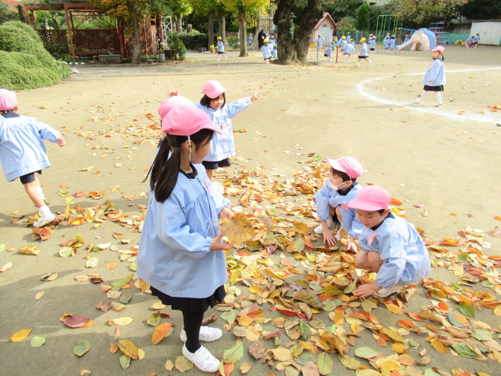 外遊びでは、気持ちの良い秋空の下で沢山の落ち葉を集めたり