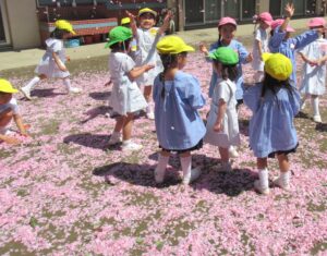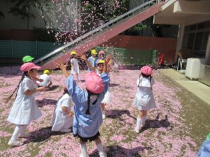 桜の花びらでいっぱいになった園庭!!